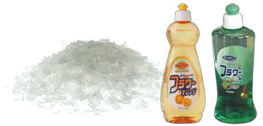 AOKI began to develop its PET bottle recycling technology in 1994 with the development of the AOKI Series machine, which molds reground PET bottle flakes directly into new bottles. AOKI has succeeded in achieving low cost bottle-to-bottle production, making it possible to now use recycled PET flakes. The traditional way to recycle PET involves an expensive and complicated process: After the PET bottles are ground and washed, the flakes are re-melted at high temperature and re-crystallized to produce recycled pellet material. With AOKI's Eco-friendly technology PET bottles are only ground and washed to produce recycled flake material. Without the melting and crystallizing processes, recycling costs are reduced. |