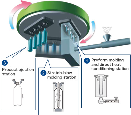 | On the Aoki machine the preform is not released until it is blown into a bottle. Consequently bottles have a much better appearance. | The Aoki machine supports, for producing bottles, alternative materials (without BPA) like: Polypropylene (PP), Polyphenylsulfone (PPSU), Polyamide (nylon) and PES (polyethersulfone). |